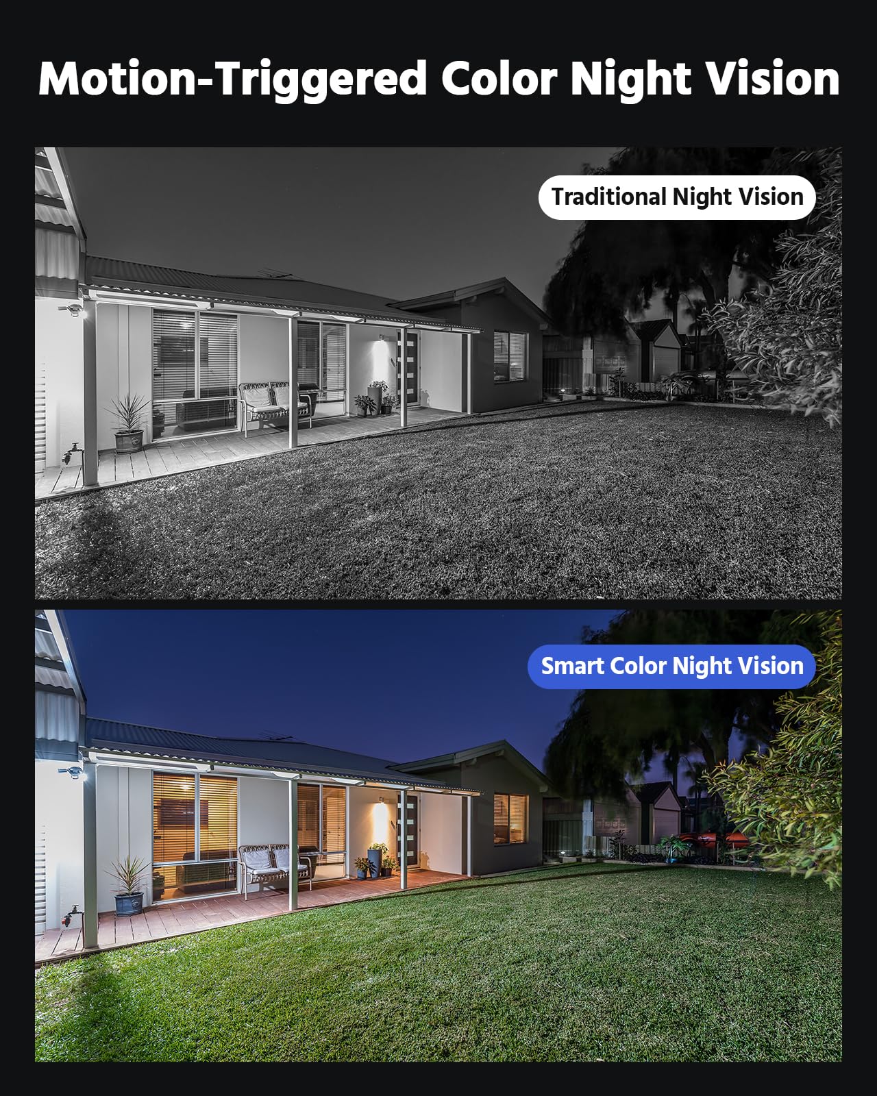 - 【Clear Night Vision】This home security camera features a dual-light function, combined with 1080P resolution and 3.6mm lens, delivering ultra-clear night vision up to 66ft in complete darkness. Its enhanced light-capturing capability ensures clear colour night vision, setting it apart from the rest.