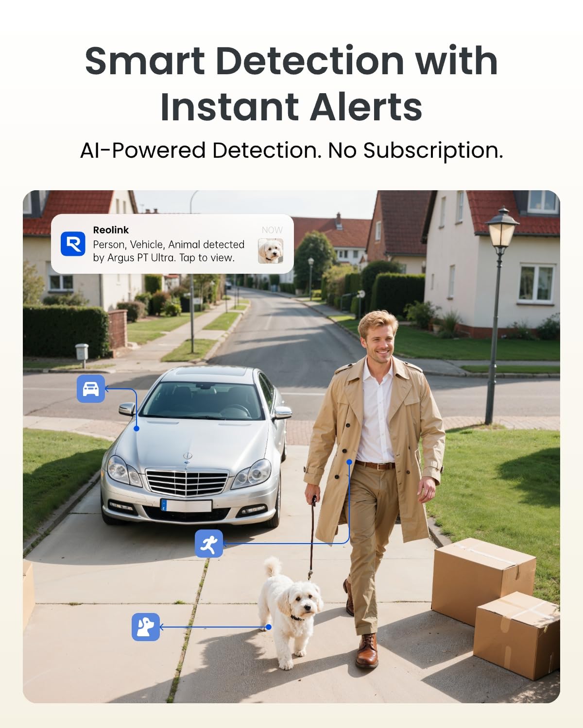 - AI DETECTION + TWO-WAY AUDIO + SOUND & LIGHT ALARMS: You’ll never miss any motion events of person, vehicle, or animals with multiple alerts, including push notifications, siren, and spotlights. With two-way audio, easily greet visitors or warn off intruders